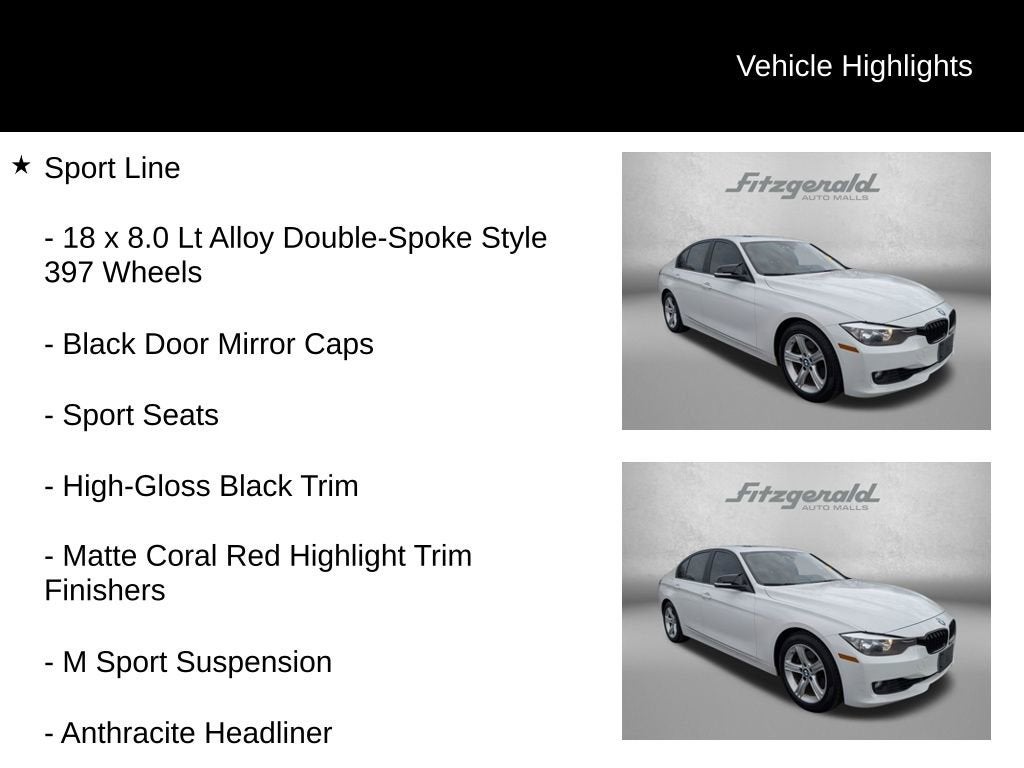 2013 Alpine White BMW 3 Series 8-Speed Automatic 18 x 8.0 Lt Alloy Double-Spoke Style 397 Wheels, Anthracite Headliner, Black Door Mirror Caps, High-Gloss Black Trim, Increased Top Speed Limiter, M Sport Suspension, Matte Coral Red Highlight Trim Finishers, Moonroof, Sport Line, Sport Line Aesthetic Elements, Sport Seats. 2.0L 4-Cylinder DOHC 16V Turbocharged 328i You will love our NO HAGGLE, NO HASSLE PRICING here at Fitzgerald Auto Mall. Ask us about our BUYER PROTECTION PLAN, LOANER CAR PROGRAMS, AND FREE Vehicle History Report. Can not find what you want?? NO PROBLEM! We have over 1,000 Pre-Owned vehicles available at WWW.FITZMALL.COM. You can also visit us in person at 114 Baughmans Lane Frederick MD, 21702 or Call Us @240-629-7301.