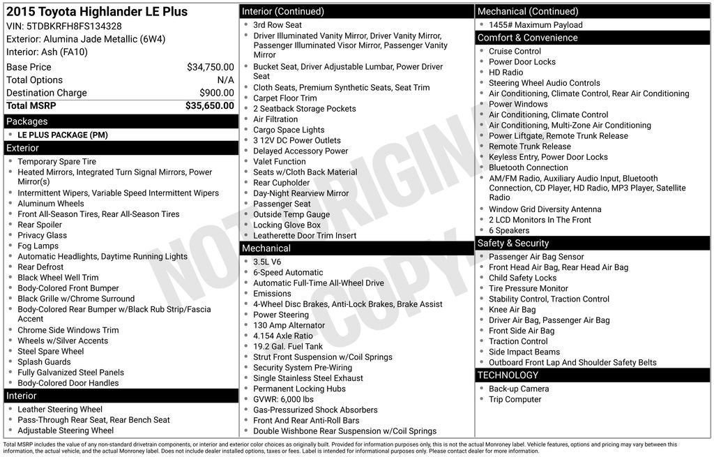 Alumina Jade Metallic 2015 Toyota Highlander LE Plus V6 AWD 6-Speed Automatic Electronic with Overdrive 3.5L V6 DOHC Dual VVT-i 24V AWD.