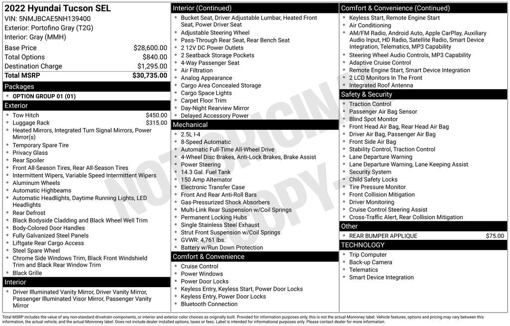 Portofino Gray 2022 Hyundai Tucson SEL AWD 8-Speed Automatic with SHIFTRONIC 2.5L I4 DGI DOHC 16V LEV3-ULEV70 187hp AWD.
