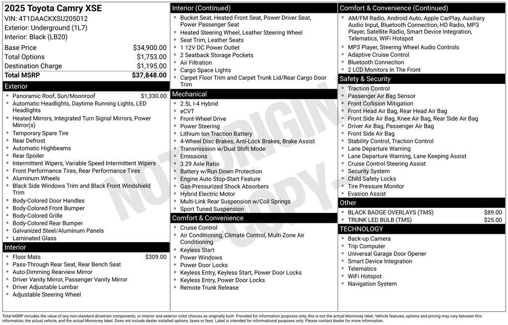 Certified. Underground XSE FWD eCVT 2.5L 4-Cylinder 16V DOHC Back Up Camera, Bluetooth®, Clean History Report, a Clean Carfax, 2.5L 4-Cylinder 16V DOHC, Black w/Leather Seat Trim, 4-Wheel Disc Brakes, 6 Speakers, ABS brakes, Active Cruise Control, AM/FM radio: SiriusXM, Apple CarPlay/Android Auto, Auto High-beam Headlights, Automatic temperature control, Brake assist, Dual front impact airbags, Dual front side impact airbags, Electronic Stability Control, Emergency communication system: Safety Connect (up to 10-year trial subscription), Exterior Parking Camera Rear, Four wheel independent suspension, Front anti-roll bar, Front dual zone A/C, Fully automatic headlights, Heated door mirrors, Heated Front Bucket Seats, Heated steering wheel, Knee airbag, Low tire pressure warning, Occupant sensing airbag, Overhead airbag, Passenger door bin, Power door mirrors, Power driver seat, Power passenger seat, Radio: Toyota Audio Multimedia w/12.3 Touchscreen, Rear anti-roll bar, Rear side impact airbag, Rear window defroster, Remote keyless entry, Security system, Speed control, Speed-sensing steering, Split folding rear seat, Steering wheel mounted audio controls, Telescoping steering wheel, Tilt steering wheel, Traction control, Variably intermittent wipers, Wheels: 19 Smoke Gray & Black-Finished Alloy.