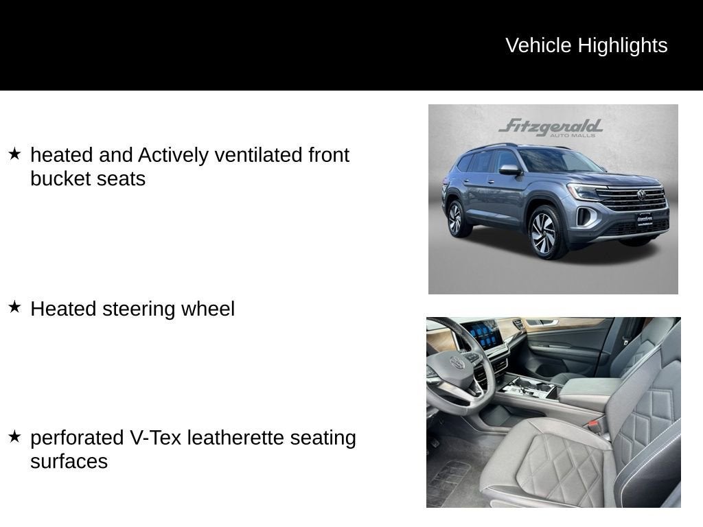 2025 Platinum Gray Metallic Volkswagen Atlas 8-Speed Automatic heated and Actively ventilated front bucket seats, Heated steering wheel, perforated V-Tex leatherette seating surfaces. 2.0L TSI 2.0T SE w/Technology You will love our NO HAGGLE, NO HASSLE PRICING here at Fitzgerald Auto Mall. Ask us about our BUYER PROTECTION PLAN, LOANER CAR PROGRAMS, AND FREE Vehicle History Report. Can not find what you want?? NO PROBLEM! We have over 1,000 Pre-Owned vehicles available at WWW.FITZMALL.COM. You can also visit us in person at 114 Baughmans Lane Frederick MD, 21702 or Call Us @240-629-7301.