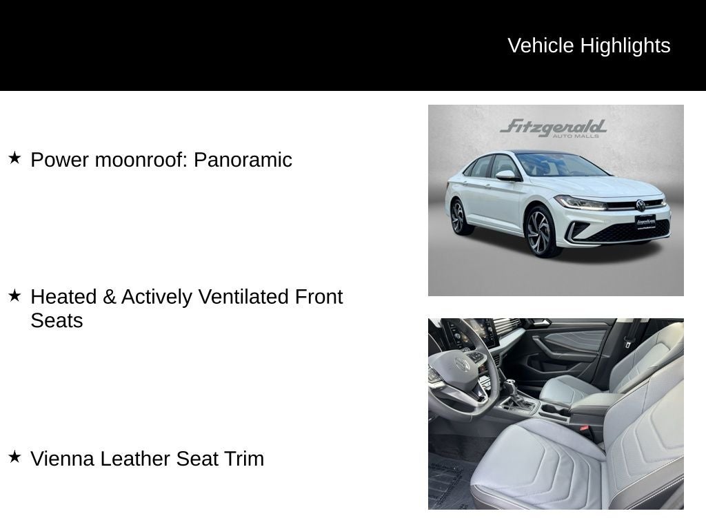 2025 Opal White Volkswagen Jetta 8-Speed Automatic with Tiptronic Black Leather, Heated & Actively Ventilated Front Seats, Power moonroof: Panoramic, Vienna Leather Seat Trim. 1.5L I-4 DI DOHC Turbocharged 1.5T SEL You will love our NO HAGGLE, NO HASSLE PRICING here at Fitzgerald Auto Mall. Ask us about our BUYER PROTECTION PLAN, LOANER CAR PROGRAMS, AND FREE Vehicle History Report. Can not find what you want?? NO PROBLEM! We have over 1,000 Pre-Owned vehicles available at WWW.FITZMALL.COM. You can also visit us in person at 114 Baughmans Lane Frederick MD, 21702 or Call Us @240-629-7301.