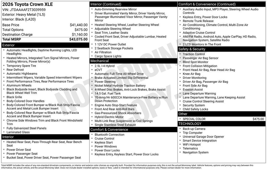 Certified. Heavy Metal XLE AWD CVT 2.5L DOHC Sunroof / Moonroof, Back Up Camera, Bluetooth®, Clean History Report, a Clean, One Owner Carfax, 4-Wheel Disc Brakes, 6 Speakers, 8-Way Adjustable Heated/Ventilated Front Seats, ABS brakes, AM/FM radio: SiriusXM, Apple CarPlay/Android Auto, Auto High-beam Headlights, Automatic temperature control, Brake assist, Dual front impact airbags, Dual front side impact airbags, Electronic Stability Control, Emergency communication system: Safety Connect (5-year minimum), Exterior Parking Camera Rear, Four wheel independent suspension, Front anti-roll bar, Front dual zone A/C, Fully automatic headlights, Heated door mirrors, Heated rear seats, Heated steering wheel, Knee airbag, Low tire pressure warning, Occupant sensing airbag, Overhead airbag, Passenger door bin, Power door mirrors, Power driver seat, Power passenger seat, Radio: 12.3 Toyota Audio Multimedia, Rear anti-roll bar, Rear window defroster, Remote keyless entry, Security system, Speed control, Speed-sensing steering, Split folding rear seat, Steering wheel mounted audio controls, Telescoping steering wheel, Tilt steering wheel, Traction control, Variably intermittent wipers, Wheels: 19 Multi-Spoke Machined-Finish Two-Tone Alloy.